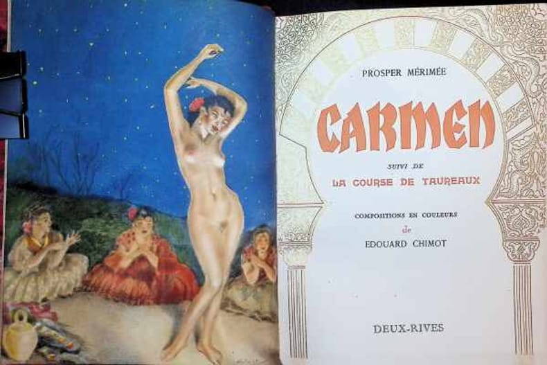 1952 Paris, Deux-Ri!ves, 1952; in-8° de 164pp. - (1) f. (achevé d'imprimer). Encadrements et lettrines en or et rouge, les encadrements des pages sont inspirés des dentelles de marbre du patio de las Munecas à Séville. Les 15 compostions de Chimot hors texte en couleurs (dont la couverture) ont été tirées en lithographie. Reliure en plein maroquin noir, décor aux filets courbes et droits dorés sur les deux plats, mosaïqué de maroquin rouge et citron au 1er plat, titre doré poussé au 1er plat mosaïqué de maroquin citron, dos lisse, auteur et illustrateur dorés en tête et pied , titre doré en long au centre, intérieur des plats de suédine rouge, bordé de deux listels de maroquin rouge et citron, garde de suédine rouge, couverture illustrée conservée,tête dorée, étui.