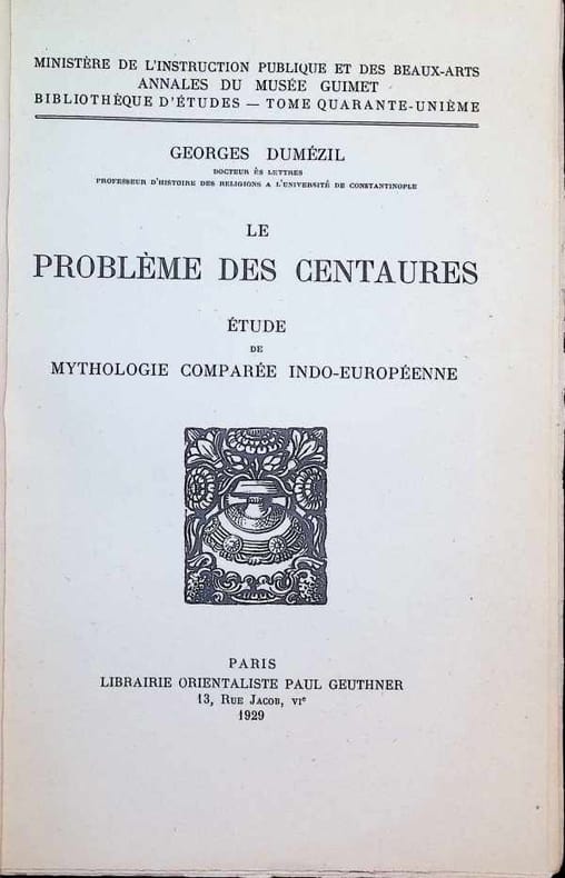 Bel exemplaire de cette édition originale de toute rareté. L'immense spécialiste de la mythologie comparée qu'est Georges Dumézil (1898-1986) publia cet ouvrage important 5 ans après ses thèses consacrées au "Festin d'Immortalité" et au "Crime des Lemniennes" ; on y découvre les premiers balbutiements de sa méthode de mythologie comparée qu'il développera avec le succès que l'on sait. Malgré la rupture épistémologique de 1939, Georges Dumézil citera encore cet ouvrage sur les Centaures à la fin de sa carrière.