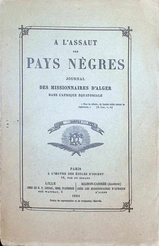 Paris, A l’Oeuvre des Ecoles d’Orient, 1884 - in-8 : 347 pp., 16 grav. & 1 carte dépl. h.t. - demi-rel. d’ép. défraîchie, dos décollé, portrait gravé en front. du Cardinal Lavigerie, carte partielle des Missions d’Afrique équatoriale (déchirée sur 5 cm. sans manque) gravée par Erchard ; 1 peinture faite par un enfant in-t.