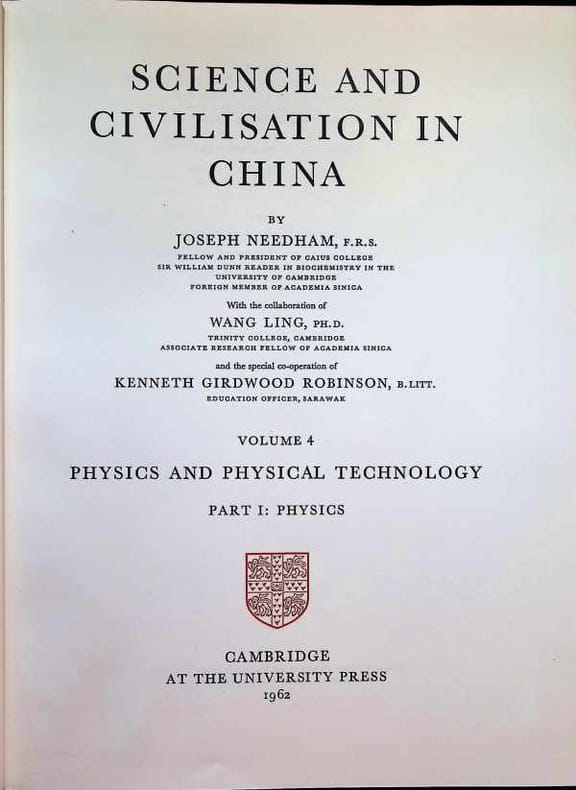 Science and civilisation in China. Volume 4, physics and physical technology, part I: physics. (Cambridge : University Press, 1977). [M.C.: Chine, histoire des sciences]