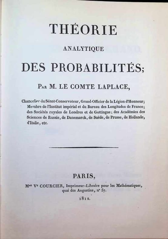 L’édition originale d’un ouvrage fondamental dans l’histoire des mathématiques, l’un des textes fondateurs de la théorie des probabilités par « le Newton français ». Paris, Mme Ve Courcier, 1812 [-1820].In-4 de (3) ff., 464 pp., (1) f. d’errata, 34 pp., 50 pp., 36 pp. Des rousseurs. Relié en demi-maroquin aubergine à grain long, à coins, dos lisse orné de filets dorés. Coins et mors frottés. Reliure de l’époque fatiguée. 254 x 203 mm.