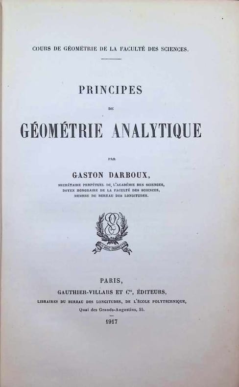 ---- EDITION ORIGINALE ---- "Le nouveau volume que je soumets aujourd'hui au jugement du public mathématique est le résumé des leçons que j'ai faites depuis 1872 soit à l'Ecole Normale Supérieure, soit à la Faculté des Sciences de Paris". (Préface) ---- "Prominent in these geometric researches was G. Darboux. He was for a half a century conspicuous as a teacher. By his researches, Darboux enriched the synthetic, analytic and infinitesimal geometries, as well as rational mechanics and analysis...". (Cajori p. 315) - DSB III pp. 559/560**1508/N7DE-Cav.F2-F4