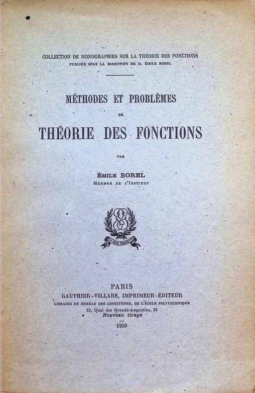 ---- EDITION ORIGINALE ---- "Borel's innovations are essentiel in twentieth century analysis and probability. He was the most successful mathematician of his generation in using specific problems and results as scientific parables pointing the way to broad theories that still remain fertile... His Leçons laid the basis of measure theory so solidly that in that field the letter Borba de Moraes, eans Borel...". (DSB II pp. 302/305)**N7DE+CAV.G3