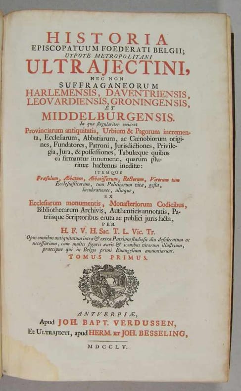 Volledig Leer (Hardcover), Latijn, staat: Zeer Goed. 2 delen, folio; 34 pl. (hier en daar vlekjes, sommige bladen licht verkleurd door ouderdom, vochtvlekken in de onderste binnenmarge van deel 1). lederen band, getitelde ruggen met verhoogde banden (verbindingen en ruggen licht geschuurd, hoeken licht gestoten).rnHerdruk van de Leidse uitgave van 1719 van dit werk van Van Heussen (1659-1719), verdeeld in 2 volumes. Het eerste deel bevat de geschiedenis van het bisdom Utrecht. Het tweede deel bevat de andere 5 delen over de geschiedenis van de bisdommen Haarlem, Deventer, Leeuwarden, Groningen en Middelburg. Gravures: grote uitvouwbare kaart van Zeeland, 6 uitvouwbare stadsplattegronden (Utrecht in het jaar 690, Middelburg, Veere, Vlissingen, Zierikzee, Goes), 12 uitvouwbare portretten van heiligen door Cornelis II (2) en Frederik (10) Bloemaert naar hun vader Abraham, en 8 andere portretten (waarvan 2 uitvouwbaar), 4 uitvouwbare stadsgezichten en 3 kerkillustraties (o.a. de Sint-Maartenskathedraal in Utrecht). 2 titelvignetten. Talrijke gravures in de tekst met afbeeldingen van kerken. Titels in rood en zwart.rn