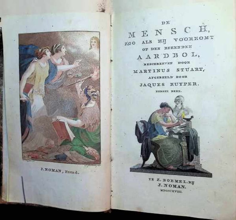 Demi cuir, couverture rigide / marbrée (le dos présente des dommages et les coins sont enfoncés), 22 x 14 cm, 234 pages, néerlandais, première édition, illustrations avec notamment une carte dépliante avec des dessins de crânes de différentes origines, à l'intérieur : Très bon. [Cette description peut avoir été traduite par une IA.]