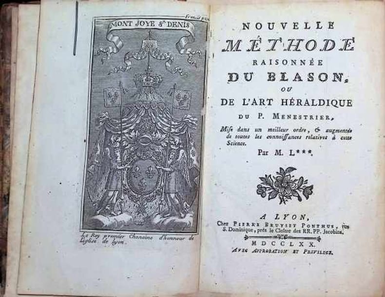 1770 Lyon: P. Bruyset-Ponthus, 1780. In-8 relié: 12.5 x 19 cm, 1 front. grav., 8 ff.n. chiff. [titre, épître avertissemernt, sommaire] 1 pl. grav. [épitre d'édicatoire], 619 pp., 49 pl. grav. chiff. 1 à 49 18 ff. n. chiff. [tables, privilèges] + 49 pl. grav. Nouvelle édition de cet incontournable manuel d'héraldique illustré d'un frontispice, d'un épître dédicatoire et de 49 pl. gravées dont 1 dép. Reliure de l'époque en veau blond moucheté. Dos à cinq nerfs avec pièce de titre en maroquin rouge et caissons ornés aux petits fers. En excellent état.