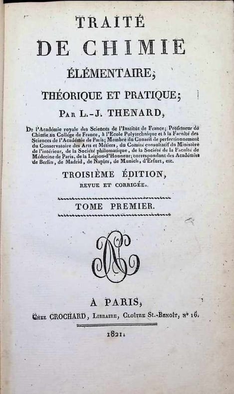 Third edition of Thenard's classic and influential text-book. ""Thenard was the author of a large and important chemistry textbook that went through six editions and was translated into German, Italian, and Spanish (the section on analysis was translated into English). Through this book he helped restore France to its traditional role as supplier of chemistry textbooks to the rest of the world"" his only serious rival was the British chemist Thomas Thomson, who during the first two decades of the nineteenth century produced successive editions of his own textbook."" (DSB).