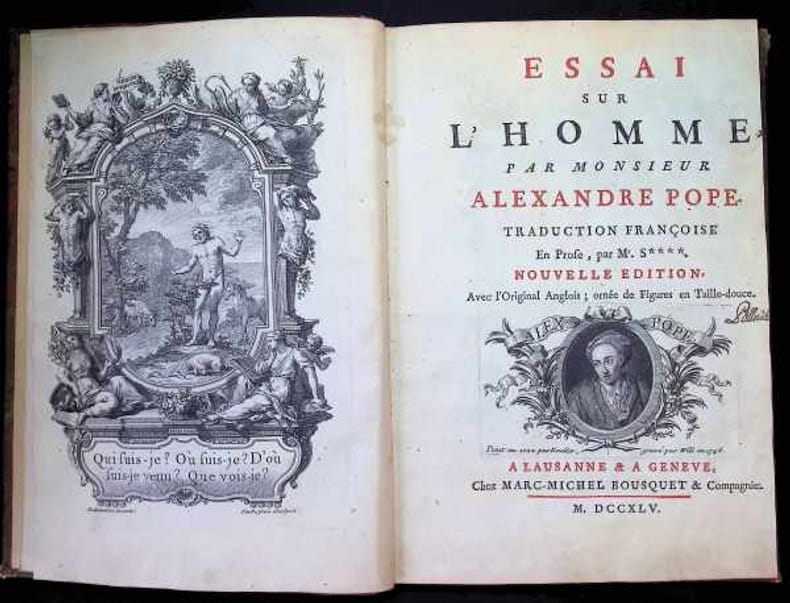 2006, Score, in-folio cartonné de 115 pages, couverture skyvertex marron, reproduction en fac similé de l'édition de 1745 chez Marc-Michel Bousquet & compagnie, Essai sur l'Homme par Monsieur Alexandre Pope, texte en français et en anglais | Etat : bon état (Ref.: G7812)