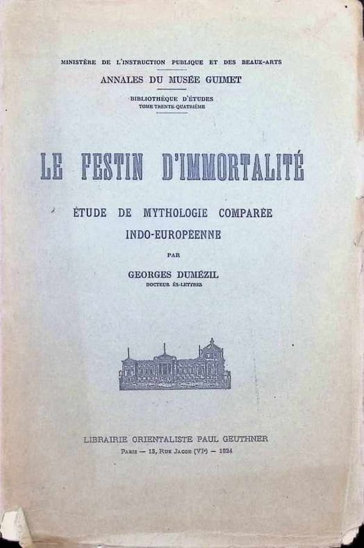 Librairie Orientaliste Paul Geuthner Paris, Librairie Orientaliste Paul Geuthner, 1924. Grand In-8 broché de XIX + 316 pages. Collection des Annales du Musée Guimet. Bibliothèque d'études, Létude porte sur le mythe de limmortalité tel quil est conçu dans les traditions indo-iraniennes, notamment à travers le soma (chez les Indiens) et le haoma (chez les Iraniens), qui sont des boissons rituelles censées conférer limmortalité ou des pouvoirs divins. Dumézil y examine le mythe du festin où les dieux acquièrent limmortalité grâce à cette boisson divine. Il explore les variantes du mythe dans les cultures indo-européennes, y compris dans les traditions indiennes (Rig-Véda) et iraniennes (Avesta). Louvrage propose une comparaison structurale des récits mythologiques afin den extraire des constantes symboliques et rituelles. Dumézil montre que ce mythe du festin ou de la boisson dimmortalité nest pas isolé : il a des équivalents dans dautres mythologies indo-européennes, comme Lambroisie des Grecs, Lhydromel chez les Scandinaves, Le vin sacré des mystères dionysiaques.Il propose lidée que ce mythe renvoie à une structure commune indo-européenne, où la boisson divine symbolise laccession à une puissance surnaturelle, réservée à une élite divine ou héroïque.LLe festin dimmortalité marque la frontière entre les dieux et les hommes. La possession de la boisson sacrée donne accès à une forme dabsolu limmortalité, la force, la souveraineté. Dumézil jette ici les bases de son futur travail sur les fonctions tripartites indo-européennes, en montrant que ce mythe est lié à la fonction souveraine (magico-religieuse). Cest un travail précurseur de ce qui deviendra plus tard sa théorie des trois fonctions (sacerdotale, guerrière, productive). Peu courant.