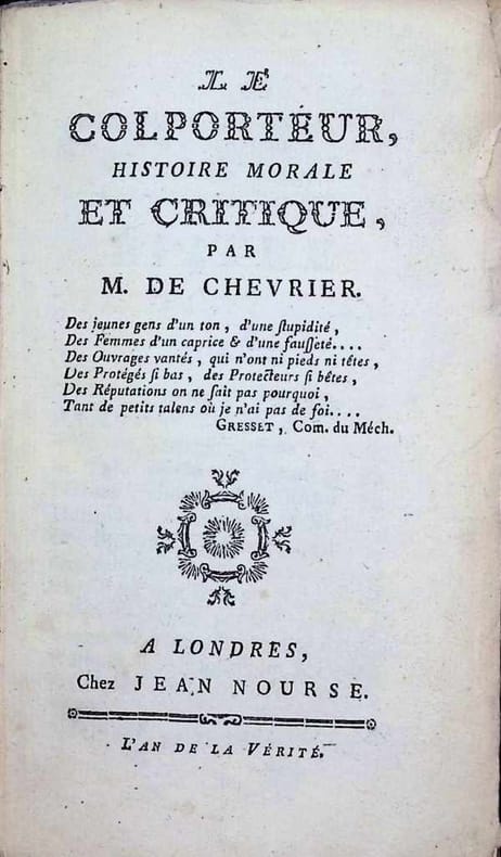 Edition originale. Chevrier (Nancy 1720 - Rotterdam 1762), écrivain satirique et licencieux, après avoir attaqué dans ses ouvrages de nombreuses personnalités, dut se retirer en Allemagne puis en Hollande, pourchassé par ses ennemis. Dans le Colporteur, roman satirique, il règle ses comptes avec la sottise en égratignant au passage les auteurs qu'il méprise : Caraccioli, l'abbé Trublet, Palissot, Ximénès, Fréron, etc. L'ouvrage fut interdit en France et l'auteur fit l'objet d'une demande d'extradition qui ne put aboutir car il mourut peu de temps après. Barbier II, 575; Gay-Lemonnyer II, 435; Cioranescu, 19477; Quérard II, 186.