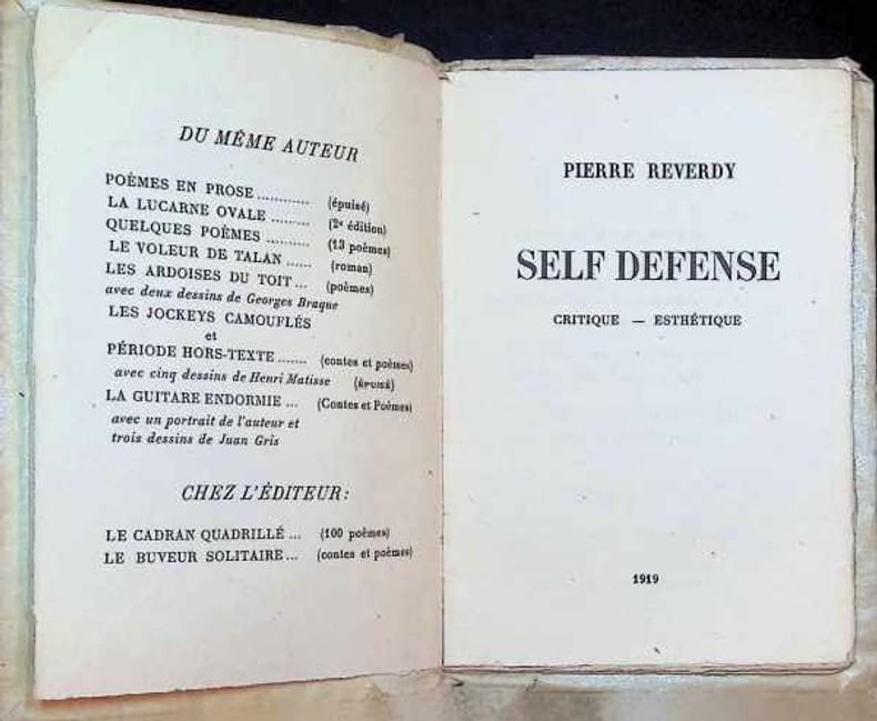 Couverture souple originale de l'éditeur avec jaquette: Très bon, 15 x 11 cm, pages non numérotées pp., français, 1ère édition, état du livre: Très bonrnSelf Defense (sous-titré Critique-Esthétique) est un ouvrage théorique du poète français Pierre Reverdy, publié pour la première fois en 1919.rnCe texte est fondamental pour comprendre l'esthétique de l'avant-garde du début du XXe siècle, particulièrement en ce qui concerne le cubisme et ses liens avec la poésie. Contrairement à ce que le titre pourrait suggérer, il ne s'agit pas d'un manuel de combat physique, mais d'une défense intellectuelle et artistique des principes de Reverdy pendant une période de grands bouleversements créatifs à Paris.rnDétails clés :rnPublication : Publié à l'origine par l'Imprimerie littéraire à Paris. L'édition originale était très limitée (environ 364 exemplaires).rnContenu : Le livre se compose de brefs essais et d'aphorismes sur l'art, la poésie et la nature « plastique » de l'image. Reverdy y définit sa conception de l'image poétique, qu'il décrit comme le rapprochement de deux réalités lointaines.rnContexte : Écrit alors que Reverdy était étroitement lié à des artistes tels que Pablo Picasso, Georges Braque et Juan Gris, ce texte sert de manifeste pour le « cubisme littéraire ».