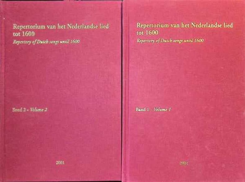 Hardcover, 25 x 17 cm, 919 blz., Nederlands / engels, Eerste editie, staat: Zeer Goed. Dit tweedelige repertorium bevat ruim 7621 verschillende liedteksten en 1158 verschillende melodieën, verzameld uit bronnen tot het jaar 1600