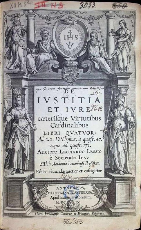 Full-Leather (Hardcover) the back has been professionally restored, 35 x 23 cm, [14], 803, [68] pp., Latin, book condition: Very Good. In 1609, the second edition of the influential work "De iustitia et iure caeterisque virtutibus cardinalibus" (On Justice and Law and the Other Cardinal Virtues) by the Flemish Jesuit Leonardus Lessius (15541623) was published.rnHere are the key details regarding this specific edition and the work:rnPublication: The 1609 edition was printed by the renowned Officina Plantiniana (Jan Moretus) in Antwerp. It is the Editio Secunda (second edition) of the work originally released in 1605.rnContent: The book is a theological and legal treatise based on the Secunda Secundae of Thomas Aquinas's Summa Theologiae (questions 47 to 171). It focuses on the application of justice and moral law.rnEconomic Innovation: Starting with this 1609 edition, an important appendix regarding the Monti di Pietà (montes pietatis or Mountains of Piety) was added. This was crucial for the ethical justification of modern banking practices, specifically regarding interest and lending.rnHistorical Significance: Lessius is highly regarded in this work for his sophisticated understanding of economics. He applied moral principles to complex 17th-century commercial practices, such as insurance, exchange rates, and market pricing. Although the first edition was published in Leuven in 1605 by Jan Masius, the 1609 version from the Plantin press was the first to be thoroughly revised and expanded by the author himself for the international market.
