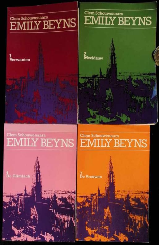 Zachte kaft 4 delen 20 x 12,5cm, 1322 blz., Nederlands, staat: Zeer Goed. De cyclus bestaat uit vier romans en behandelt intriges binnen welgestelde Antwerpse families tussen 1939 en 1980. rnDe volledige cyclus, die als een hoogtepunt in het oeuvre van Schouwenaars wordt beschouwd, omvat de afzonderlijke romans:rntVerwanten: tweede druk 1983rntMeeldauw: eerste druk 1981rntDe Vrouwen: tweede druk 1983rntDe Glimlach : tweede druk 1983rnDe verhaallijn concentreert zich op de verwikkelingen, schaduwverledens en onopgeloste vragen binnen deze families, waarbij thema's als afschuw, verlangen en sociaal isolement aan bod komen. rn