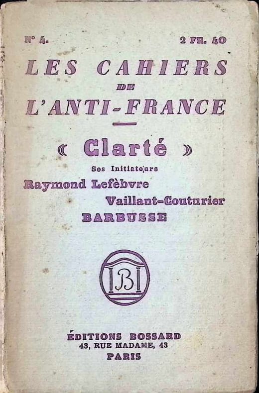 5e numéro des "Cahiers de l'Anti-France", périodique destiné à dénoncer les agissements des agents de "la trahison, du défaitisme, des doctrines révolutionnaires du bolchevisme bolchevisant", écrits par un certain Jean Collot sous le pseudonyme de Jean-Maxe. 10 numéros parus entre 1922 et 1924.