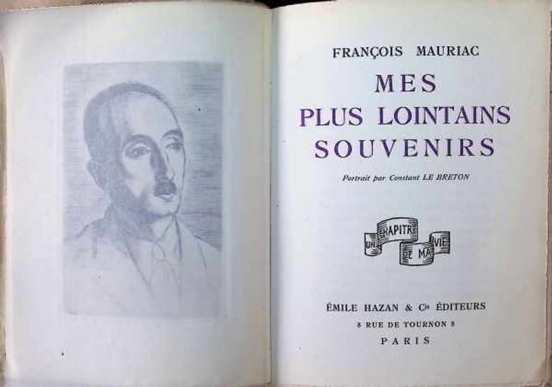 Paris Émile Hazan, coll. "Un chapitre de ma vie" 1929 1 vol. broché in-8, broché, couverture rempliée, 81 pp., portrait-frontispice gravé par Constant Le Breton. Édition originale. Tirage limité à 1000 exemplaires, celui-ci un des 40 de tête sur Japon impérial, non justifié. En bonne condition.Enrichi en frontispice d'un beau portrait de Mauriac par Constant Le Breton, ce texte apparaît comme un premier retour de l'écrivain sur son enfance. Du cercle de famille il célèbre d'abord «les pauvres morts» : le père qu'il n'a pas connu, ses grands-parents. Il se dépeint comme inséparable de sa mère, une femme pieuse qui l'élève parmi les prières et les cantiques. «Enfant triste et que tout blessait», écolier moyen, il souffre au collège de la promiscuité. Il a gardé toutefois un excellent souvenir de ses maîtres marianites, qui lui ont ouvert l'esprit et fait découvrir Montaigne et Pascal. Le besoin de se «délivrer par l'écriture» d'un journal, de poèmes lui vient très tôt.
