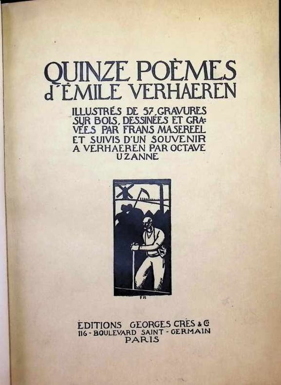 Paris, Georges Crès & Cie, 1917 . Grand in-8° broché, couverture beige imprimée à rabats, non coupé. Illustrés de 57 Gravures sur bois, dessinées et gravées par Frans Masereel et suivis d'un souvenir à Verhaeren par Octave Uzanne. Tirage à 1555 exemplaires, celui-ci le numéro 108 des 190 sur papier Fabiano (2ème papier).