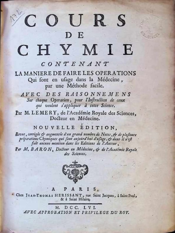 Reliure en cuir pleine. Le dos du livre doit être réparé, la couverture avant se détache partiellement, 26 x 20 cm, (XXIII) + 945 pp., français, illustrations, état du livre : Bon. Le livre est célèbre pour avoir introduit une approche corpusculaire et mécaniste de la chimie. Bien que la théorie de Lavoisier ait commencé à s'imposer peu après, l'édition de Baron en 1766 reste le témoignage ultime de la chimie pré-moderne dite ""lémérienne"". Hyacinthe-Théodore Baron (le Jeune). Baron a révisé, corrigé et considérablement augmenté le texte original avec de nombreuses notes pour l'adapter aux connaissances du milieu du XVIIIe siècle. Contenu : L'ouvrage détaille les opérations chimiques utilisées en médecine (préparation de remèdes, distillations, extractions). Illustration : 7 planches gravées dépliantes situées en fin d'ouvrage, illustrant les instruments de laboratoire (fourneaux, cornues, alambics). 2 tableaux des caractères chimiques (symboles de l'époque) également dépliants. [Cette description peut avoir été traduite par une IA.]