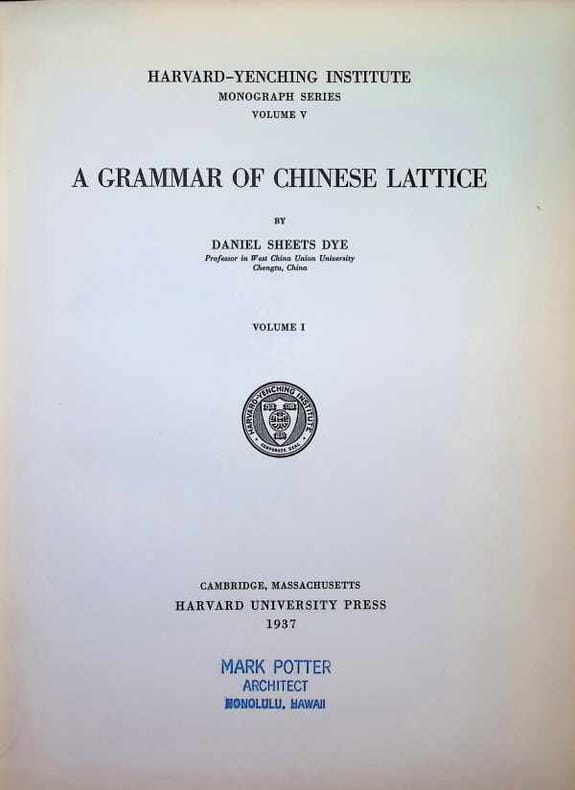 Hardcover, 31 x 23 cm, 469 pp., English, 1st Edition, 2 volumes, Illustrations, book condition: Very Good. This is is a seminal work by Daniel Sheets Dye, first published in 1937 by the Harvard University Press. It is a comprehensive catalog of over 1,200 traditional Chinese window and grille designs collected over 20 years. rnKey DetailsrntAuthor: Daniel Sheets Dye (18841976), who spent decades teaching in West China.rntScope: Covers lattice patterns constructed between 1000 BC and 1900 AD, classifying them into 265 groups based on geometric foundations like parallelograms, octagons, and "ice-rays".rntSignificance: It is widely cited by modern graphic designers, mathematicians, and architects for its systematic investigation of parametric shape grammarsthe recursive rules used to generate complex patterns.rn