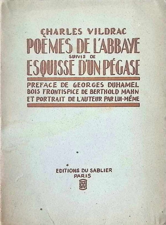in-12 carré illustré, 117p. Couverture imprimée :: EDITION ORIGINALE tirée à 770 exemplaires comprenant un bois gravé de Berthold Mahn : L'abbaye de Créteil; et un portrait de l'auteur par lui-même. Un des 30 premiers exemplaires numérotés du JAPON Impérial signés par Vildrac. Notre exemplaire est enrichi d'un ENVOI autographe de l'auteur à Georges de Menasce et d'un manuscrit autographe signé, avec quelques ratures et corrections, du début du poème "Parabole" publié dans cette édition, et quelques vers pour un autre poème. Ce manuscrit de 41 vers sur feuillet in-8 replié est signé et daté du 26 octobre 1907 (rousseurs). :: Bonne reliure signée Barast, plein chagrin marron avec un faisceau de filets à froid sur le plat supérieur, dos lisse, tête dorée, couvertures conservées. Bon état.