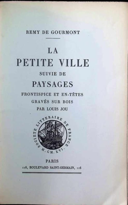 Paris, Société Littéraire de France, 1916 ; in-8, 122 pp., broché. Exemplaire numéroté. Succession de très petits textes (1 à 2 pages). Frontispice et en-têtes gravés sur bois par Louis JOU. Rémy de Gourmont a été un écrivain et critique littéraire très brillant, ami de Villiers De l'Isle Adam, Huysmans, Mallarmé et Mirbeau. Défiguré par un lupus, il reste cloîtré chez lui à écrire et ne sort de chez lui que pour se rendre chez son éditeur, le Mercure de France. Très bon état.