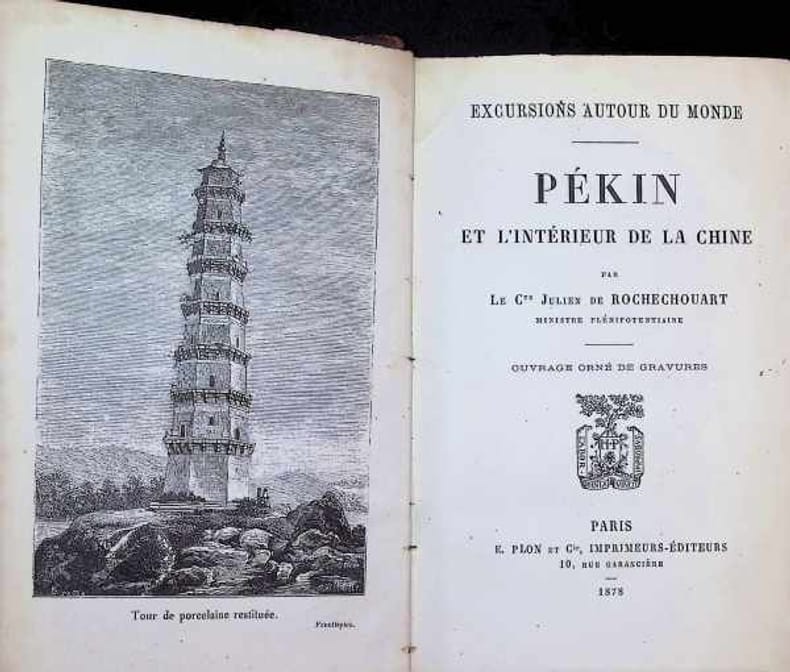 Edition originale de ce récit de voyages entre 1867 et 1876. De Paris à Suez, de Suez à Hong-Kong, Hong-Kong et Canton, de Hong-Kong à Pékin, Pékin et ses environs, la Mongolie et le Chansi, Ta-yuen-fou, Ho-kien-fou, le Yang-tze-kiang, le lac Po-yang, Han-kow. Julien de Rochechouart était ministre plénipotentiaire en Chine de 1878. Cordier, Sinica, 2139.
