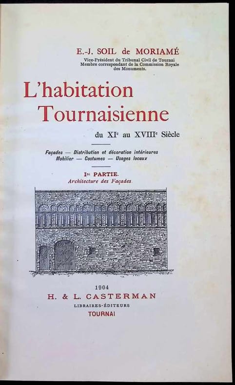 Reliure demi-cuir, 24 x 17 cm, 476 pp., français, 1ère édition, illustrations, état du livre: Très bonrnLe première partie de cette oeuvre et la seule qui a été publiée.rnCet ouvrage est considéré comme la "bible" de l'architecture civile de Tournai. Il se décompose généralement en deux grandes dimensions :rnL'Architecture des façades : C'est la partie la plus célèbre, où l'auteur analyse l'évolution stylistique, de la pierre romane du XIIe siècle à l'influence française du XVIIIe siècle.rnL'Ethnographie locale : Contrairement à un simple livre d'architecture, Soil de Moriamé y inclut une étude approfondie de la vie quotidienne, détaillant les meubles, les vêtements et les coutumes des habitants à travers les âges.rnL'ouvrage original est richement illustré de planches et de dessins qui permettent aujourd'hui de visualiser le patrimoine de Tournai tel qu'il existait avant les destructions massives de la Seconde Guerre mondiale.