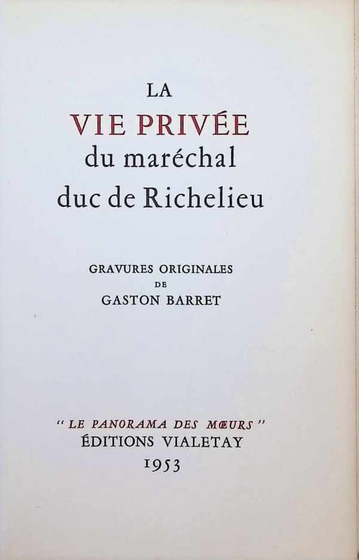Edition tirée à 425 exemplaires, un des 324 sur vélin chiffon du Marais . L'ouvrage reprend les 256 premières pages du tome 3 de l'ouvrage paru anonymement en 1791, intitulé "Vie privée du maréchal de Richelieu, contenant ses amours et intrigues... " et attribué à Louis François Faur ou benjamin de La Borde.