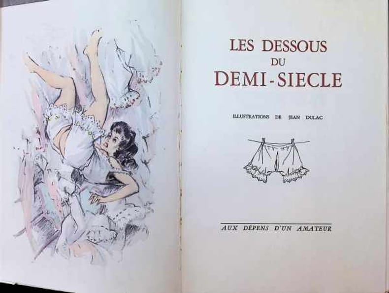 Les dessous du demi-siècle raconte les histoires coquines des dessous féminins de la Belle Epoque à Martine Carol. Les Illustrations sont tout à fait dans le ton des années 50, il magnifie la beauté féminine avec amour et sensualité. Exemplaire justifié N°969 d'un tirage de 1500 exemplaires édité "aux dépens d'un amateur". Jean DULAC (Bourgoin 1902-1968) est un artiste complet, excellent dessinateur, sculpteur, il devient même chef datelier du maître Paul LANDOWSKI, Grand Prix de Rome de sculpture. Il crée ses premières peintures (1938), en autodidacte, et parvient avec beaucoup de facilité à la maîtrise de cette nouvelle discipline. Jean Dulac est surtout le peintre du nu féminin. Les nus du début encore empreints des conventions académiques, laissent place à une abstraction expressive des corps traités en volumes. Il sera président du Salon de la Société Lyonnaise des Beaux-Arts quil fonda en 1946. Emboîtage présentant quelques usures et petites salissures.