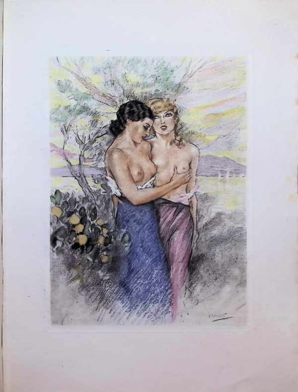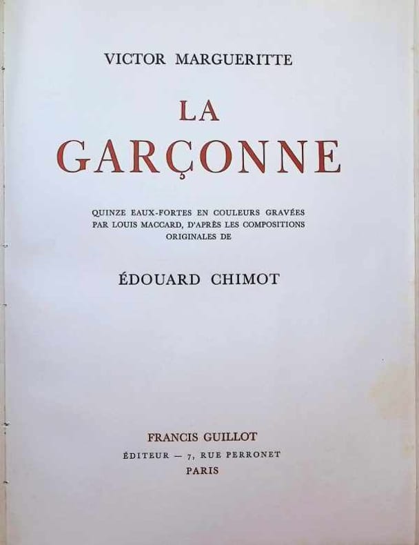 MARGUERITTE VictorLA GARÇONNE. Roman de moeurs. Illustrations de Paul-Emile BécatEditions Germaine Raoult, Paris, 1957, 25 x 30 cm., en feuilles, sous couverture rempliée, étui & emboitage cartonnés, 282 pp. intérieur frais, illustrations en couleurs par Paul-Emile Bécat, illustrations originales hors-texte (coloris par Maurice Beaufumé).Tirage à 975 exemplaires numérotés sur vélin de Rives, celui-ci un des 17 exemplaires auxquels on a joint, une suite avec remarques des illustrations et une planche refusée en deux états, (manque néanmoinsun dessin et un croquis de l'artiste),ici le n°VI.Très bel exemplaire