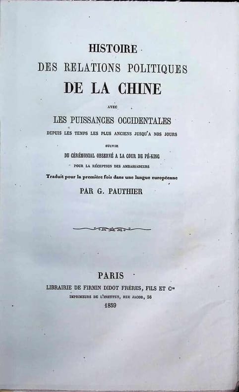 2 ff. n. ch., xx et 238 pp.Unique édition, peu commune, de cette bonne étude des relations conflictuelles entre la Chine et les diplomates européens, qui, depuis MacCartney refusaient généralement le cérémonial en usage à la Cour des Qing pour leur réception. L'orientaliste Jean-Pierre-Guillaume Pauthier (1801-1873) travailla sur plusieurs domaines, mais sa spécialité furent ses traductions du chinois
