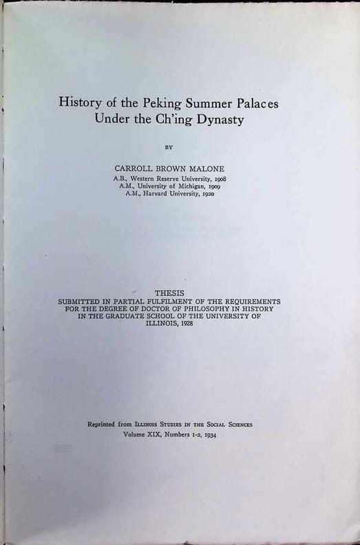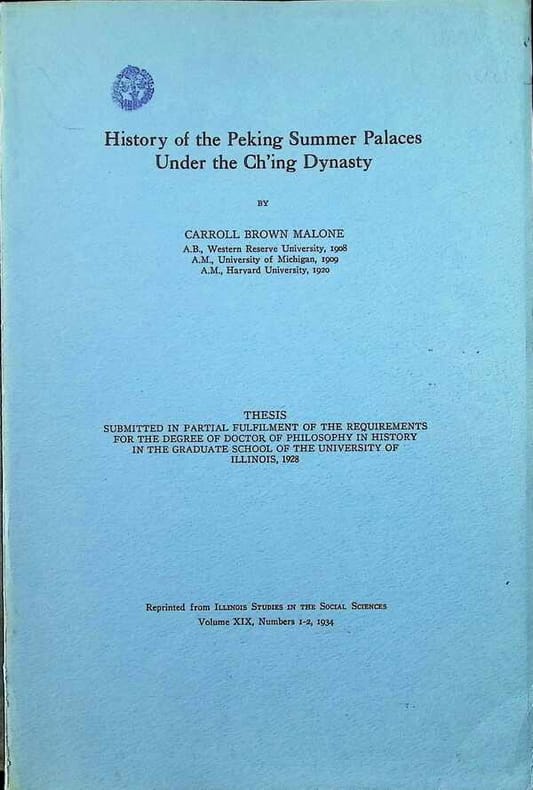 Broché, état reliure: Très bon, état de la jaquette: Très bon, 27 x 18 cm, 247 pp., anglais, 1ère édition, illustrations, état du livre: Très bon Ce travail était à l'origine la thèse de Malone à l'Université de l'Illinois en 1928 et a été publié en 1934 dans le cadre des ""Illinois Studies in the Social Sciences"". Le livre est une étude historique et architecturale approfondie des jardins impériaux de la dynastie Qing à Pékin (aujourd'hui Beijing). Il traite du développement, de l'utilisation et de la destruction finale des palais d'été, en particulier le Yuanmingyuan (l'Ancien Palais d'Été) et le Yiheyuan (l'actuel Palais d'Été). Malone a basé ses recherches sur des documents chinois rares (""????"" ou règlements de construction) de la Bibliothèque du Congrès et contient de nombreuses photos historiques, cartes et plans des palais. Il décrit comment ces lieux servaient de résidences d'été pour des empereurs tels que Kangxi et Qianlong, et comment ils formaient un mélange d'architecture chinoise traditionnelle et d'influences européennes (comme les fontaines baroques conçues par des jésuites). [Cette description peut avoir été traduite par une IA.]