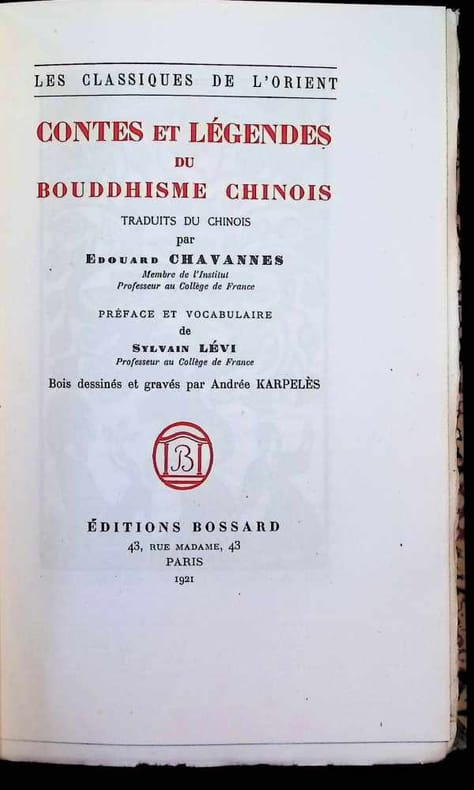 Reliure rigide, 24 x 15 cm, 220 pp., français, 1ère édition, illustrations, état du livre: Comme neuf Le livre est un ouvrage de référence, traduit du chinois par Édouard Chavannes, avec une préface et un vocabulaire de Sylvain Lévi. Ce livre rassemble vingt-cinq contes ou légendes issues du bouddhisme chinois. Recueil de contes et légendes issus de textes bouddhiques chinois, offrant un aperçu des doctrines, croyances et moeurs de l'époque. L'édition originale a été publiée par les Éditions Bossard à Paris en 1921 dans la collection ""Les Classiques de L'Orient"" volume IV, tirage de 1665 exemplaires, 140 exemplaires tirés en deux encres sur vélin d'arches à la forme, numérotés de 16 à 150 : n° 36. Couverture rigide, les couvertures souples d'origine ont été reliées. Non rogné. [Cette description peut avoir été traduite par une IA.]
