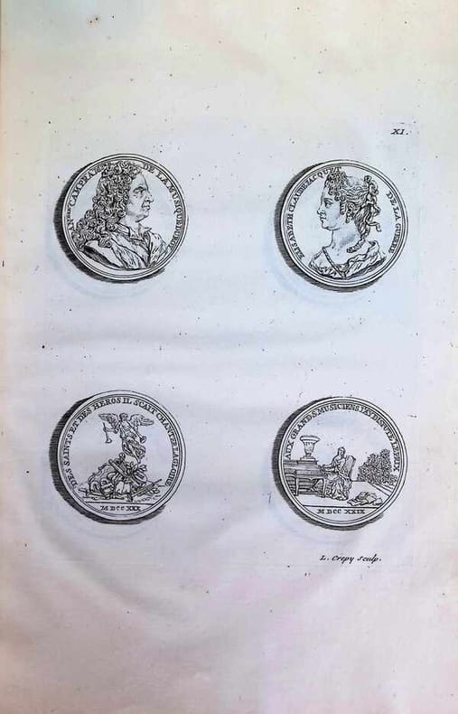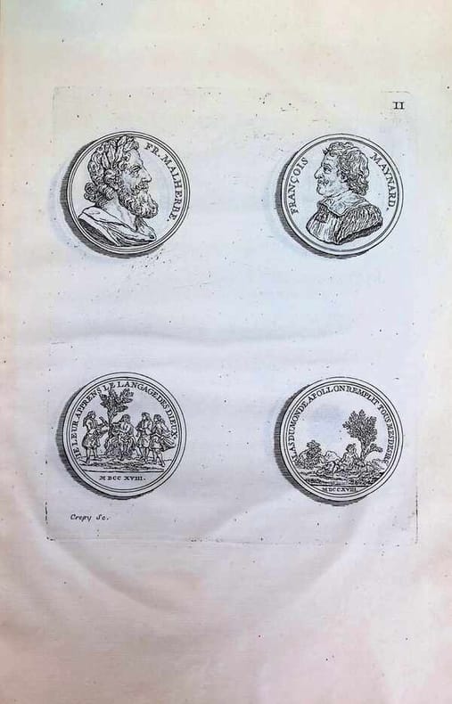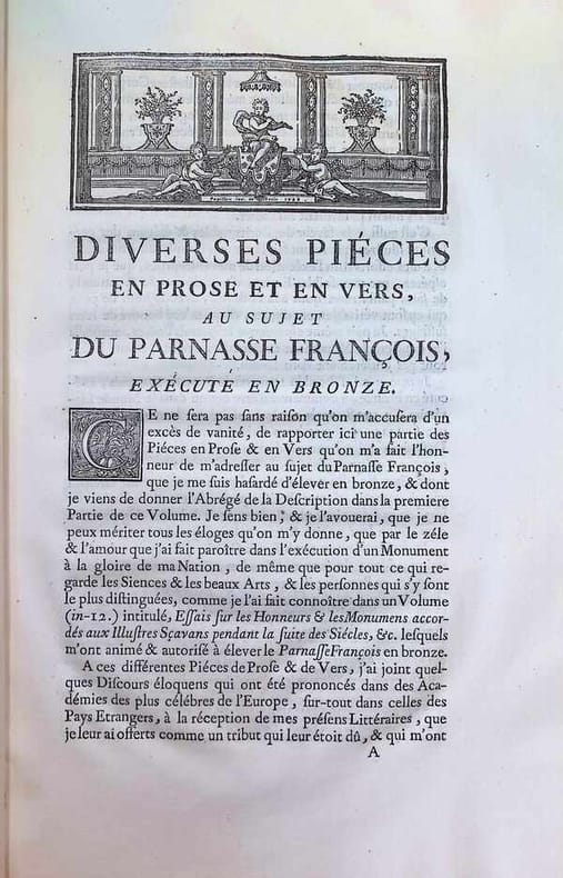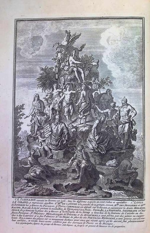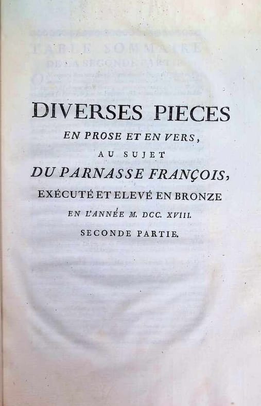 Une planche gravée représentant le Parnasse français exécuté en bronze et 17 planches représentant des médaillons.Titon du Tillet n'est connu que par le monument du Parnasse François, qu'il voulait élever à la gloire du règne de Louis XIV, et dont le modèle fut exécuté en bronze par Louis Garnier. On voit au sommet du Parnasse, Louis XIV en Apollon ; au-dessous, les Trois Grâces sont figurées par Mmes de La Suze, des Houlières et de Scudéry ; autour du mont, à la place des Neuf Muses : Corneille, Molière, Racan, Segrais, La Fontaine, Chapelle, Racine, Boileau et Lully tenant le médaillon de Quinault ; des médaillons représentent les hommes moins célèbres. Titon ne put faire élever ce grand monument qu'il voulait voir se dresser sur une place ou dans un jardin public. Bon exemplaire.