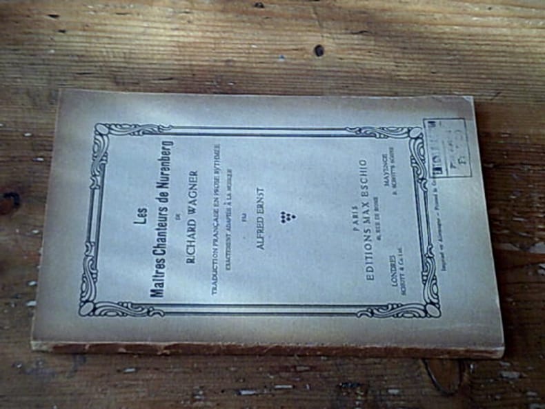 11. Edition Schott, broché, en français. In-12, 135 pages. Bon état traduction francaise en prose rythmée axactement adaptée à la musique par Alfred Ernest. Joint "la walkyrie" du même edition, broché, bas du dos abimé, interieur tres bon. Photos possibles