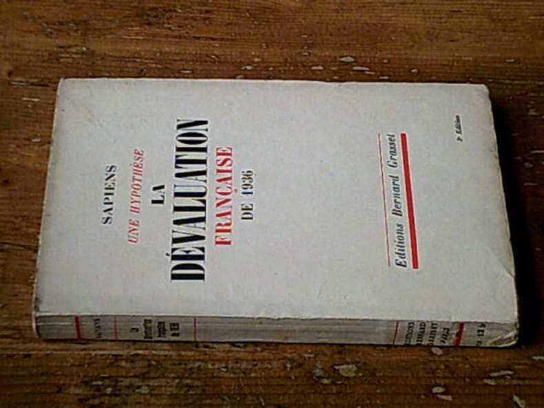 1ere édition Contents, Chapitres : Introduction - L'hypothèse de la dévaluation - Le spéculateur et la dévaluation - L'épargnant et la dévaluation - Le producteur et la dévaluation - L'économie française et la dévaluation - Conclusions tampon sur le plat supérieur de la couverture, et sur la page de titre, sinon bon état, papier à peine jauni, infime dechirure au coin du plat inférieur de la couverture, sans manque