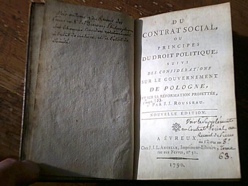 Premier volume de la "Collection complète des oeuvres de J. J. Rousseau, citoyen de Genève" contenant les ouvrages de politique. Rousseurs, coins frottés.
