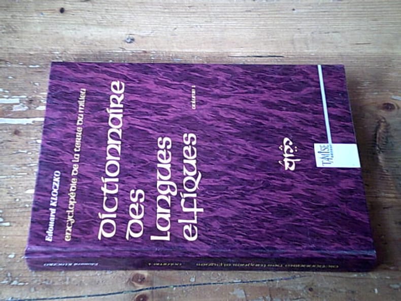 Tamise 1995 214 pages collection Encyclopédie de la terre du milieu. Grand In-8. 1995. cartonné. 214 pages. Avec des figures en noir - Le 'Dictionnaire des langues elfiques' d'Édouard Kloczko est un ouvrage de référence trilingue (quenya-français-anglais) consacré aux langues construites par J.R.R. Tolkien en particulier le quenya (haut-elfique). Publié en 1995 par les éditions Tamise il constitue le premier volume d'une encyclopédie projetée sur la Terre du Milieu et est présenté comme un travail de recherche érudit et sans équivalent en français à l'époque