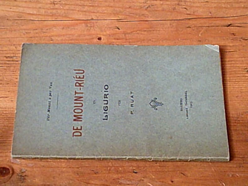 Tacussel 1923 30 pages Marsiho. in-12. 1923. broché. 30 pages. Le livre 'De Mount-Riéu en Ligurio' de Paul Ruat publié en 1923 est un récit en occitan/provençal qui décrit le monastère chartreux de Mount-Riéu (Mons Rivorum) fondé en 1117 par un disciple de Saint Baume et relate son histoire à travers les siècles notamment ses souffrances pendant les guerres de religion et son apogée sous la reine Jeanne et le roi René