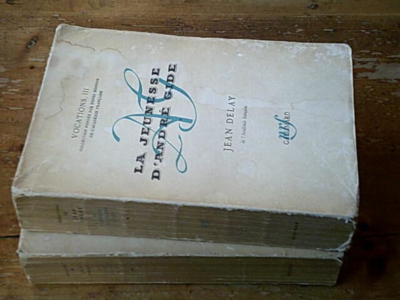 Nrf Gallimard 2026 602+680 pages collection Vocations III et VII. in-8. 2026. brochés. 602+680 pages. Avec des reproductions photographiques en noir hors-texte - Cette biographie en deux tomes de Jean Delay retrace la jeunesse d'André Gide de 1869 à 1895. Le premier tome étudie ses années de formation jusqu'à l'écriture des 'Cahiers d'André Walter' tandis que le second analyse les années de crise qui ont forgé sa personnalité adulte. L'ouvrage s'appuie sur des documents inédits notamment la correspondance avec sa mère pour analyser les problèmes de développement à différents âges