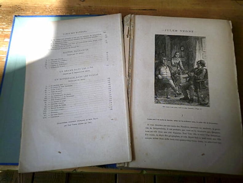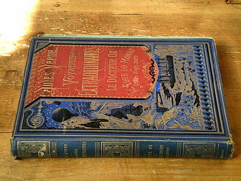 1er tirage de ce double album. Contient également les nouvelles suivantes : Maître Zacharius - Un drame dans les airs - Un hivernage dans les glace - Quarantième ascension française au Mont Blanc. Nombreuses illustrations dans le texte gravées sur bois, (de Neuville et Benett) pour le Tour du monde, (Bertrand, Froelich, Schuler, Bayard et Marie) pour le Docteur Ox.