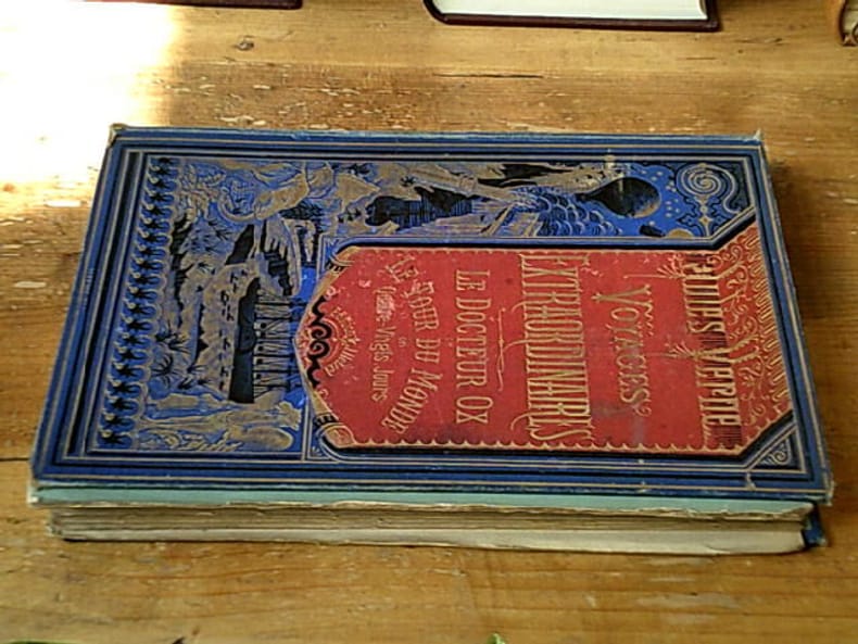 2 ouvrages en 1 volume. Les Voyages Extraordinaires. 6 hors texte en couleurs et 1 carte.1° Le Tour du monde en quatre-vingts jours. Dessins par MM. De Neuville et L. Benett. 217 pages et une carte double page.Le Docteur Ox - Maitre Zacharius - Un Hivernage dans les glaces - Un Drame dans les airs. Dessins par Bertrand, Froelich, Th. Schuler, Bayard et Marie. 211 pages. Pas de catalogue.Paris, Collection Hetzel - non daté (1905 à 1910) - 217 et 211 pages . Imprimé par Belin Frères. Relié par Engel.Cartonnage Hetzel polychrome à 1 éléphant <b>- </b>titre dans l'éventail. Dos au phare. Une décoloration en bas du dos. Tranches dorées. Gouttière régulière. 1 cahier décalé. Pas de rousseur. Très bon état. Format in-4°(28x18).