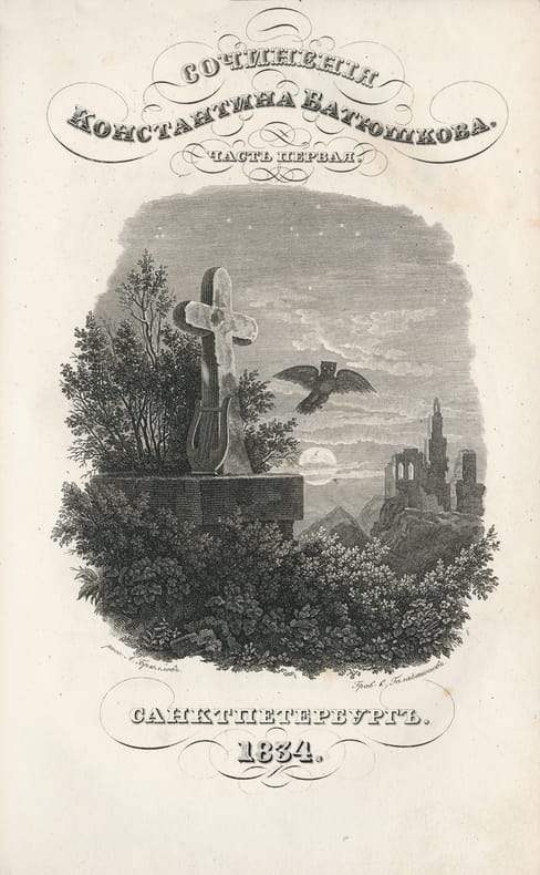 Short description: In Russian. Batyushkov, Konstantin Nikolaevich. Works in prose and poems by Konstantin Batyushkov. St. Petersburg: type. I. Glazunov, 1834. The image is provided for reference only. It may reflect condition of one of the available copies or only help in identifying the edition. Please feel free to contact us for a detailed description of the copies available. SKU3505679