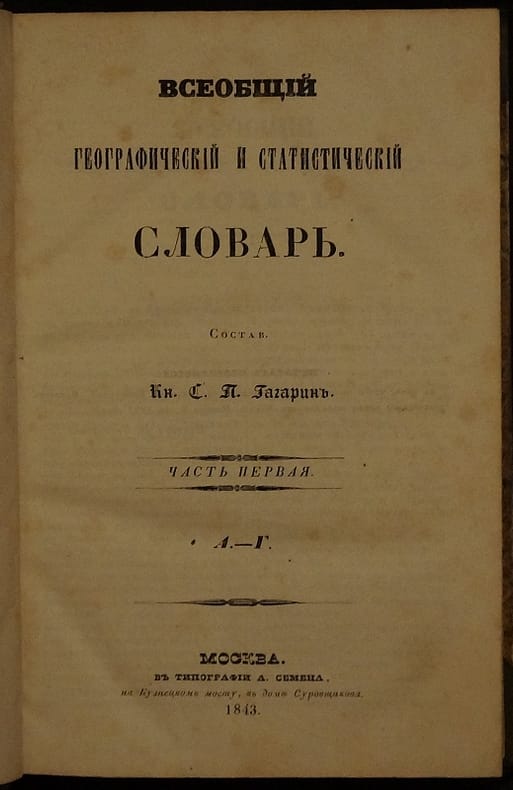 Short description: In Russian. Gagarin, Sergei Petrovich. General Geographical and Statistical Dictionary. Moscow: Type. A. Semyon, 1843. The image is provided for reference only. It may reflect condition of one of the available copies or only help in identifying the edition. Please feel free to contact us for a detailed description of the copies available. SKU3506187