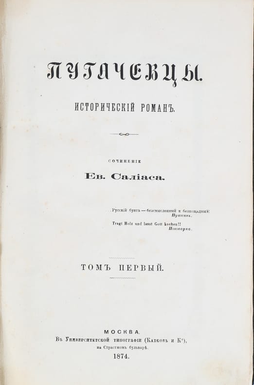 Salias E. Pugachevtsy. In Four Volumes In Russian (ask us if in doubt)/Salias Ev. Pugachevtsy. V chetyrekh tomakh Short description: In Russian (ask us if in doubt).Historical Novel: University Printing House 1874 4 138 190 + 2 190 199 + 2 172 222 + 2 176 240s. We have thousands of titles and often several copies of each title may be available. Please feel free to contact us for a detailed description of the copies available. SKUalb30fbd0cdf7404cf5
