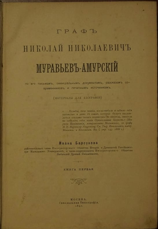 Short description: In Russian. Barsukov, Ivan Platonovich. Count Nikolai Nikolaevich Muravyev-Amursky on the basis of his letters, official documents, accounts of contemporaries and printed sources. Moscow: Synod. type., 1891. The image is provided for reference only. It may reflect condition of one of the available copies or only help in identifying the edition. Please feel free to contact us for a detailed description of the copies available. SKU3515978