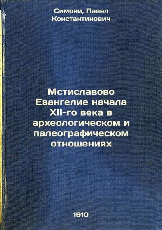 Short description: In Russian. Simoni, Pavel Konstantinovich. The Mstislav Gospel of the early 12th century in archaeological and paleographic terms: St. Petersburg: type. Aleksandrov, 1904-1910. Mstislavovo Evangelie nachala XII-go veka v arkheologicheskom i paleograficheskom otnosheniyakh. In Russian /The Mstislav Gospel of the early twelfth century in archaeological and paleographic terms. The image is provided for reference only. It may reflect condition of one of the available copies or only help in identifying the edition. Please feel free to contact us for a detailed description of the copies available. SKU3525275