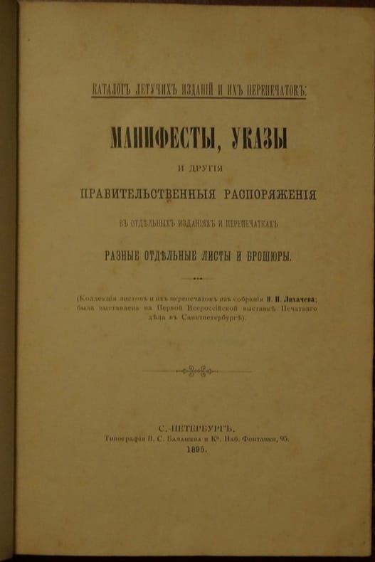 Short description: In Russian. Likhachev, Nikolai Petrovich. Catalogue of volatile publications and their reprints. St. Petersburg: Type. V. S. Balashev, 1895. The image is provided for reference only. It may reflect condition of one of the available copies or only help in identifying the edition. Please feel free to contact us for a detailed description of the copies available. SKU3549052