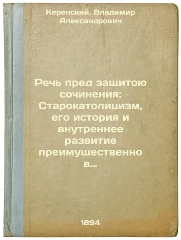 Short description: In Russian. Kerensky, Vladimir Alexandrovich. Speech before the defense of the work: Old Catholicism, its history and internal development primarily in religious terms. Kazan: Univ. Type., 1894. Rech' pred zashchitoyu sochineniya: Starokatolitsizm, ego istoriya i vnutrennee razvitie preimushchestvenno v veroispovednom otnoshenii. In Russian /Speech before the defense of the work: Old Catholicism, its history and internal development primarily in religious terms. The image is provided for reference only. It may reflect condition of one of the available copies or only help in identifying the edition. Please feel free to contact us for a detailed description of the copies available. SKU3635748