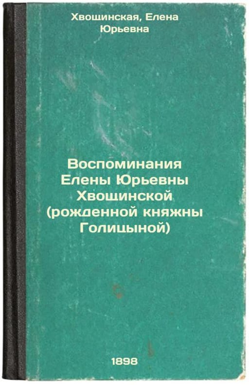 Short description: In Russian. Khvoshchinskaya, Elena Yurievna. Memories of Elena Yuryevna Khvoshchinskaya (born Princess Golitsyna). St. Petersburg: type Public utility, 1898. Vospominaniya Eleny Yur'evny Khvoshchinskoy (rozhdennoy knyazhny Golitsynoy). In Russian /Memories of Elena Khvoshchinskaya (born Princess Golitsyna). The image is provided for reference only. It may reflect condition of one of the available copies or only help in identifying the edition. Please feel free to contact us for a detailed description of the copies available. SKU3644265